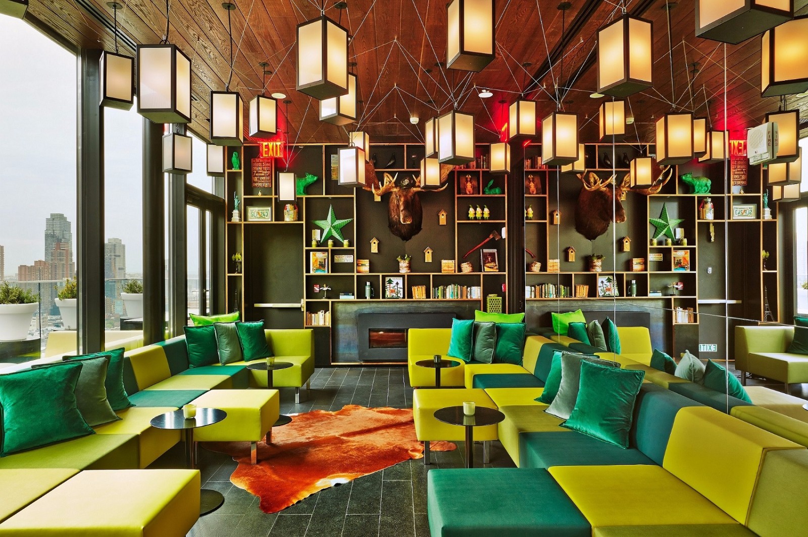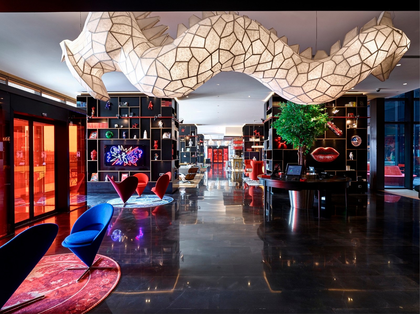 进入位于一楼的酒店正门,宾客面对的不再是传统的酒店前台,而是citizenM酒店特色的入住自助服务终端、布置精美的“起居室(Living Room) ”、collectionM 商店(采用一种独特的零售店形式,为宾客提供酒店精心挑选的各种精品礼物以及日用品)、canteenM 餐吧(全天候供应美食和酒水的开放式厨房),以及通往二楼 societyM 会议室的旋转楼梯。由泰国艺术家 Supachai T 创作的游龙灯展现了现代艺术与中国传统文化的交融,也让宾客在入住的第一时间感受到酒店的新锐设计。值得一提的是,“起居室”一直是citizenM酒店引以为豪的标志性空间。为了最大程度地营造居家感、打造完美的休闲或办公环境,“起居室”的布置选用了各式趣味十足的装饰物件、精挑细选的书籍,以及设计师品牌 Vitra 家具。特别精选的艺术品赋予了整个空间别样的色彩和活力,同时也为中国艺术家们提供了一个国际性的展示平台。
