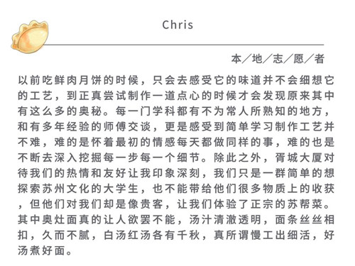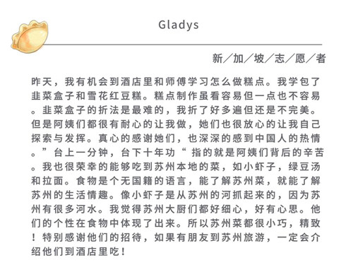 分面团、擀面皮、称重、包肉馅、收口,小伙伴们在胥城美厨娘们的指导下按步操作,神情上有种在上化学课般的严谨。体验课程排得满满当当,胥城方糕、雪花红豆糕,韭菜盒子,新加坡的Gladys感慨道,苏式糕点制作看似容易,却十分考验耐心。雪花红豆糕要用小刀划成四片花瓣型,韭菜盒子的封口要捏出花边,这是Gladys觉得最难的,可苏式糕点一向就得讲究精细。好在阿姨们很有耐心的指导,还放心地让他们自己去创造与发挥。看着自己亲手制作出的苏式点心,小点心师傅们也是相当有成就感。