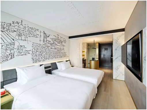 空间规划上,体现人性关怀,对住客的隐私和使用功能做出优化和强化。例如:淋浴和马桶区域独立设置,中岛吧台的设计使得空间灵活性增强,功能更多样化,并且客房内部增加了小冰箱。