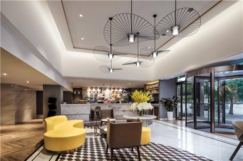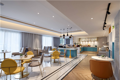大堂干净明亮,绿植、鲜花随处可见;前台“城市绘”背景墙画着南京眼、夫子庙,一碗鸭血粉丝贯穿古今,一旁站着刚从上海来到南京身着旗袍的“兰小姐”;Tiffany蓝的柜门、鲜明的黄色椅子和白色的大理石桌子,完美的融合在一起,充分体现了南京的包容与开放。
