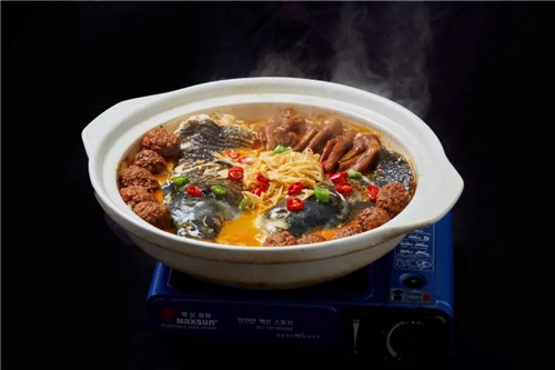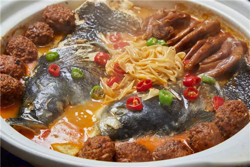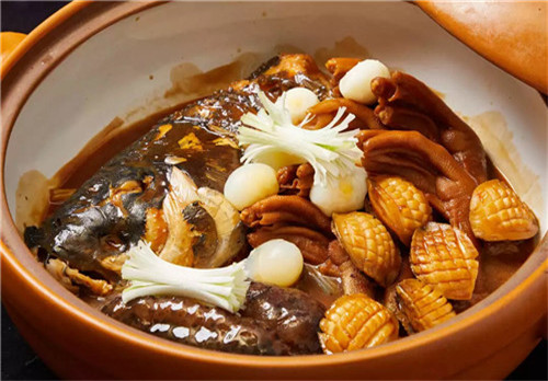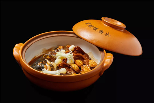 千岛湖鱼头、大连鲍、猪婆参、鸽蛋、鹅掌统统下锅,可谓是地上走的,水里游的,样样都有。江南鱼头结合了广式的做法,鱼肉晶莹如玉,色泽分明,闻起来香气扑鼻,尝起来爽滑酥嫩,肉汁四溢,尝过之后回味无穷!