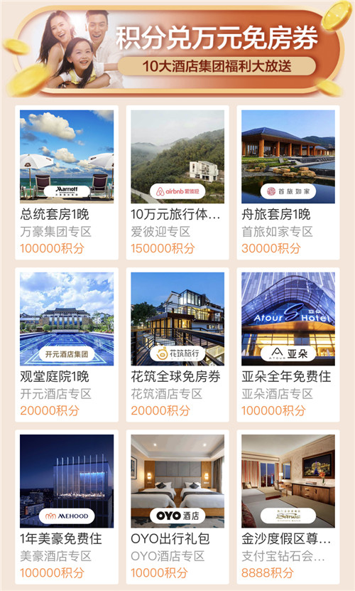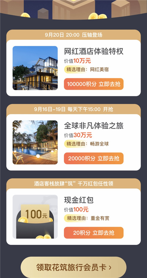 花筑旅行为本次支付宝会员日特别打造了三重超值礼遇:价值10万元的全年网红酒店尊享体验特权;价值30万的“全球非凡体验之旅”大礼包,内含价值过万元的花筑旅行全球通行证以及花筑旅行高端钻石会员特权;活动期内全时段凭积分兑换100元花筑旅行酒店现金红包。