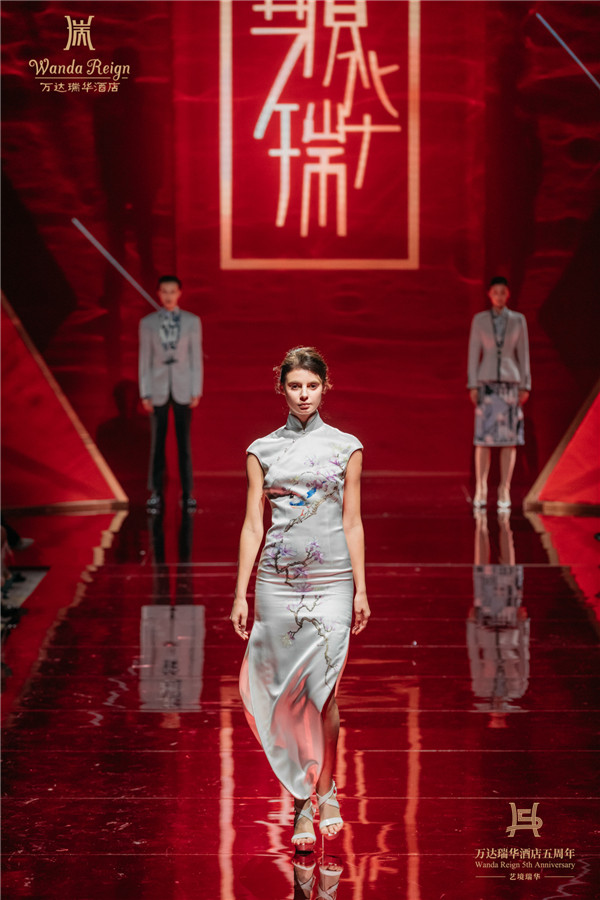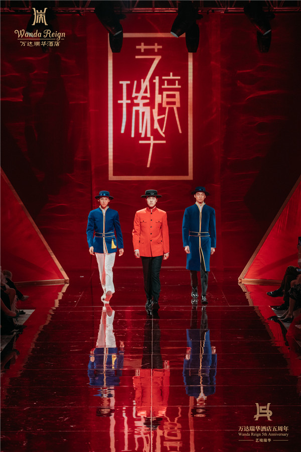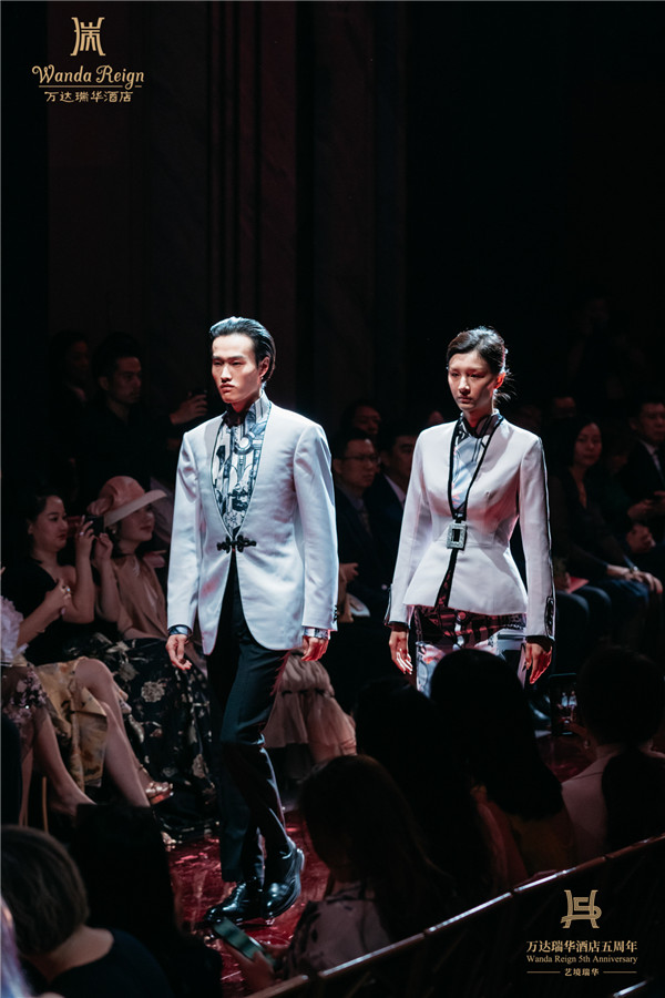 万达瑞华五周年之际,万达酒店及度假村再度携手多次受邀参加巴黎高级定制时装周的国际知名设计师劳伦斯·许续写品牌华彩新篇章。在庆典上,劳伦斯·许首先为嘉宾们带来了主题为“玉兰逢春”的全新万达瑞华员工华服。其设计采用上海市市花玉兰花元素,寓意“玉兰逢春、明媚夺目”;借鉴万达瑞华酒店“Art Deco”装饰艺术风格,运用立体裁剪工艺,让制服具有结构感的纹理;劳伦斯·许亲自设计并推出了万达瑞华五周年限量款男士口袋巾和女士方巾,为万达瑞华风华五载献礼,将是 “艺境瑞华”内涵的再次延伸。
