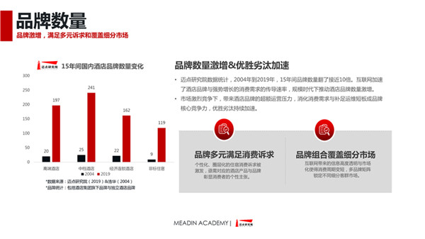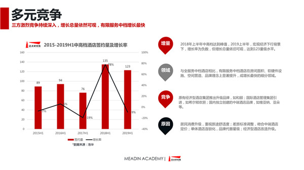 据迈点研究院发布的《2019上半年旅游住宿业品牌发展报告》显示,对比三年各大品类酒店环比增长率——中档酒店增长率67%,高端酒店增长率31%,精品及客栈民宿增长率24%,经济连锁酒店增长率仅1.5%;中档酒店遥遥领先。从2004年到2019年的15年间,中档酒店品牌数量增长率为864%。在中档酒店蓬勃发展的风口中,抢先发力的维也纳酒店公司已经获取了先发优势,并在这个优势下,结合日新月异的消费需求不断提升自己的品牌竞争力和生命力,成为行业争相效仿的标杆。