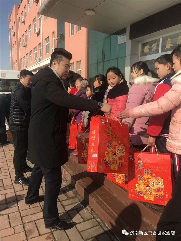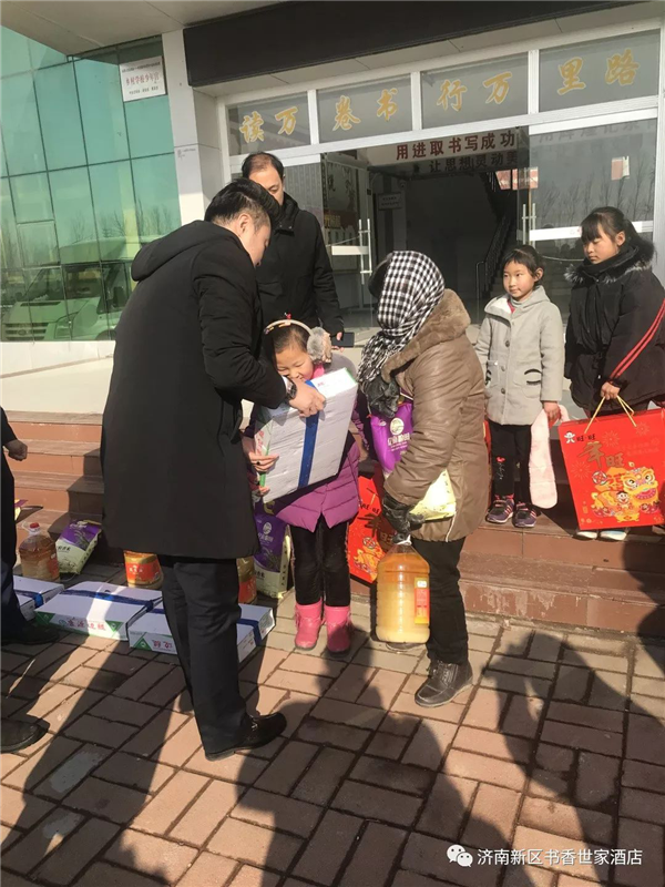 济南新区书香世家酒店于2011年在商河县沙河中学捐助“书香安康图书馆”,自同年开始,与当地妇联建立了春蕾女童定向扶持意向,多年来酒店一直坚持每年至少两次的慰问与关注。2019年1月初,酒店号召所有员工为本次的慰问活动进行了捐助,本次捐助金额达到5000余元,此次春节慰问我们给这些贫困孩子带来了大米、食用油、鸡腿、旺旺礼包等一些年货。