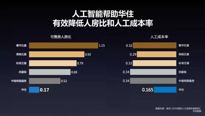那有没有办法用更少的优秀的人提供更好的服务质量?有。通过激励机制,通过智能化。这一点,华住就做得很好。据统计,2018年,人房比0.17,人工成本率0.165。