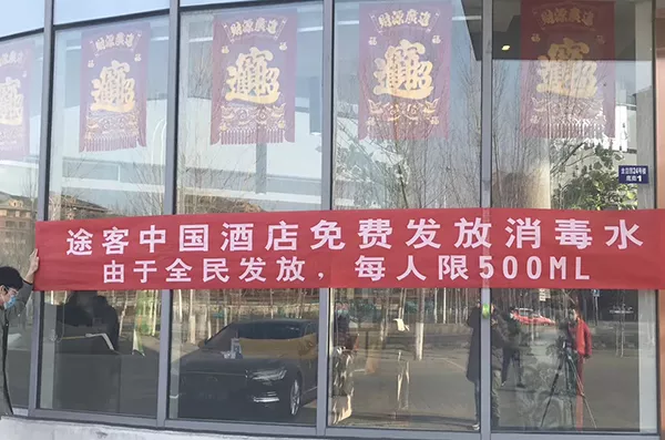 图为途客中国酒店天津津南大学城店发布的免费发放消毒水横幅。