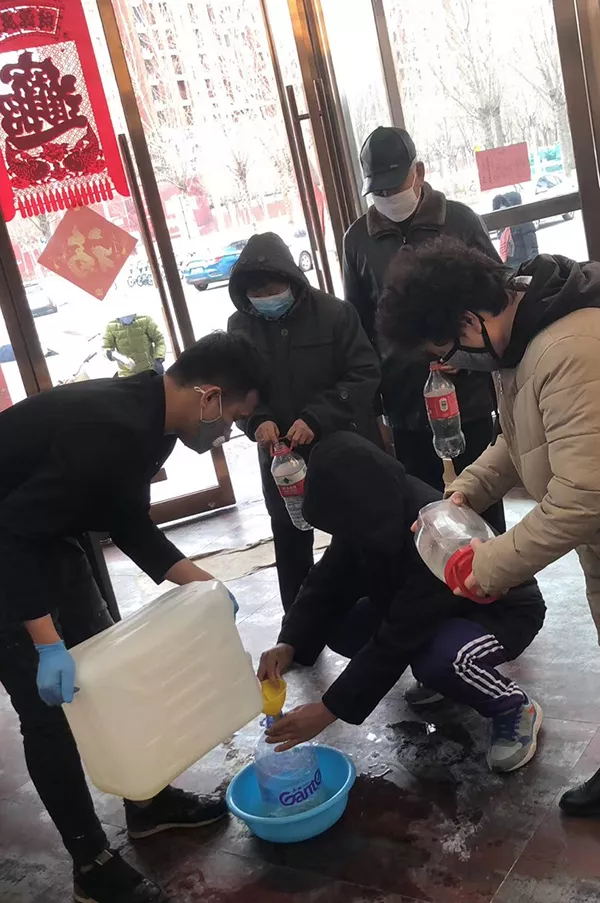 图为途客中国酒店天津津南大学城店员工给周边群众分发消毒水。