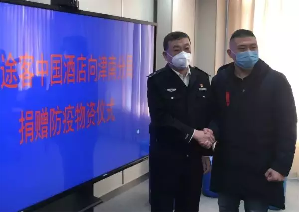 2月4日上午,途客中国酒店天津津南大学城店业主(图右),到公安津南分局捐赠消毒液及医用酒精,分局负责同志在捐赠仪式上代表分局党委接受捐赠并表示感谢。