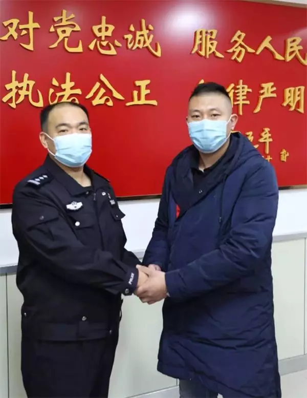 图为朱华才捐完防疫物资后与津南分局疫情防控应急处置队队长崔锦星合照!