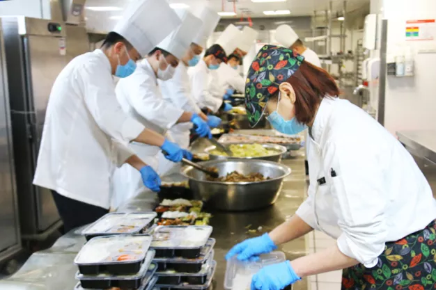 酒店厨师团队为医护人员制作营养均衡的三餐并搭配水果及乳制饮品。从备菜、装盒、保温到送至每一位医疗驰援队医护人员手中,兼顾客人口味与本地特色的食盒,既要保证餐食的味道和温度,又要确保食品卫生安全。