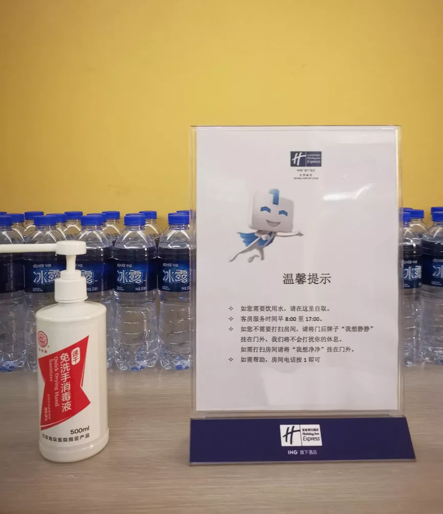 酒店公共区域及每个楼层的电梯间,都为医务人员配备了免洗消毒液及瓶装水,方便随时取用