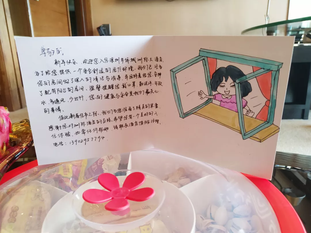 深圳华侨城洲际大酒店为到店宾客手绘定制欢迎卡,奉上防御疫情的温馨提示。