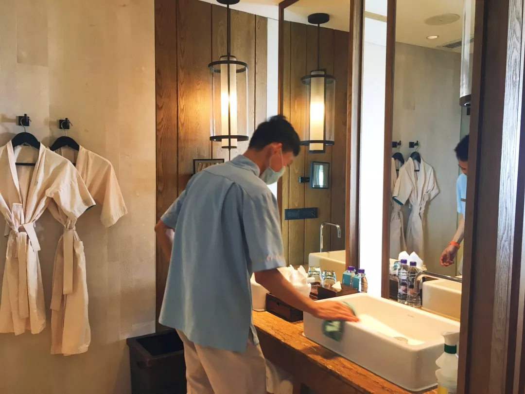 烟台南山皇冠假日酒店员工按照“清洁宝典”认真进行清洁、消毒工作。