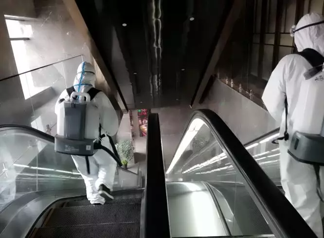 郑州郑东智选假日酒店员工对酒店电梯进行消毒。