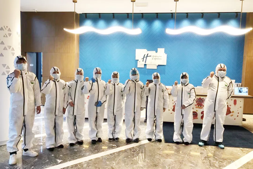 疫情期间,武汉保和皇冠假日酒店每日有专业的第三方消杀公司穿戴全套防护设备对酒店公共区域进行每日全方位消毒工作