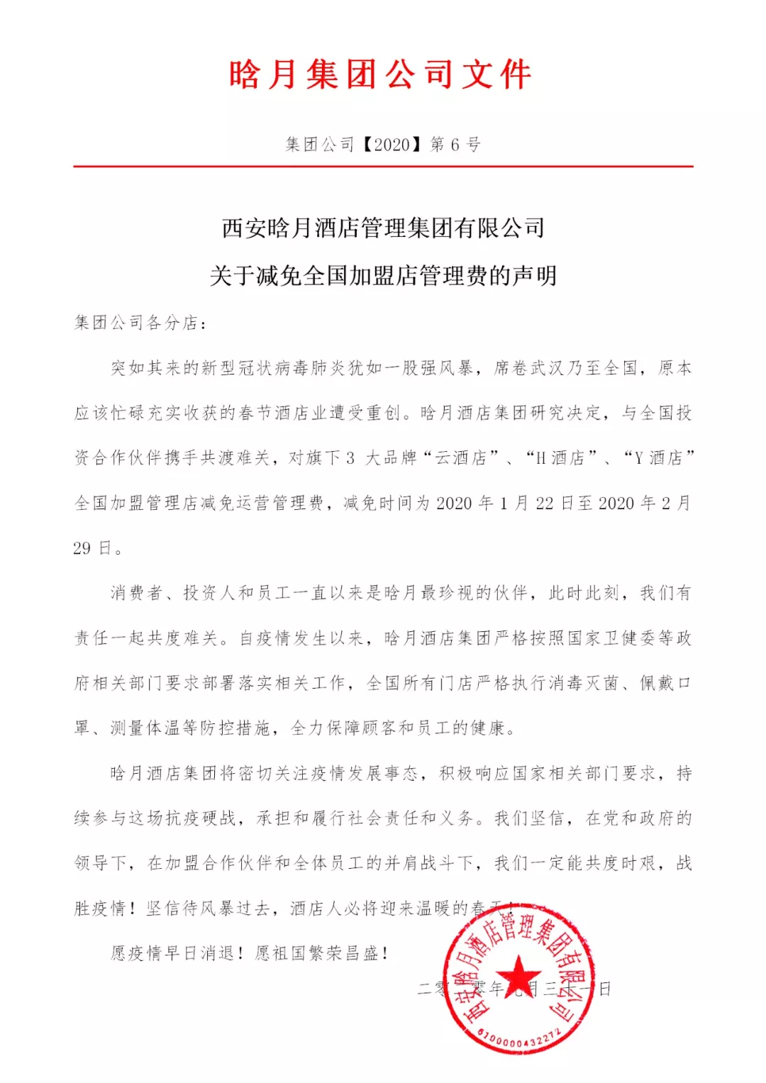 晗月酒店集团研究决定对旗下3 大品牌“云酒店”、“H酒店”、“Y酒店”全国加盟管理店减免运营管理费,减免时间为2020年1月22日至2020年2月29日。