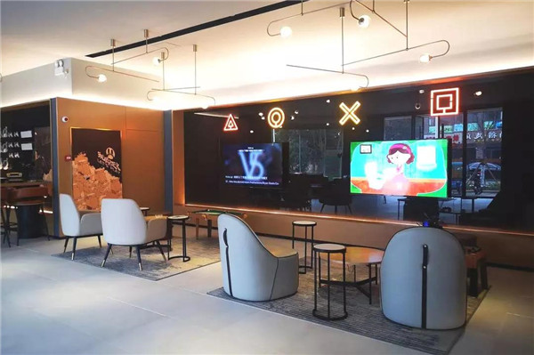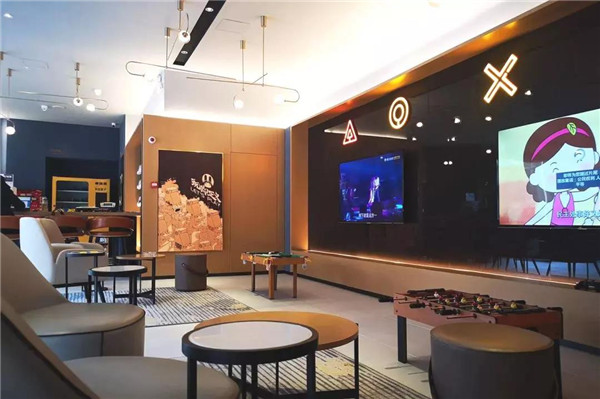 IU轻+整体采用现代设计风格,同时融入大量游戏符号元素。纯净、流畅的线条勾勒出大堂空间,同色系和撞色交织出空间层次感,室内灯光强化了空间划分,视觉上更加开阔。