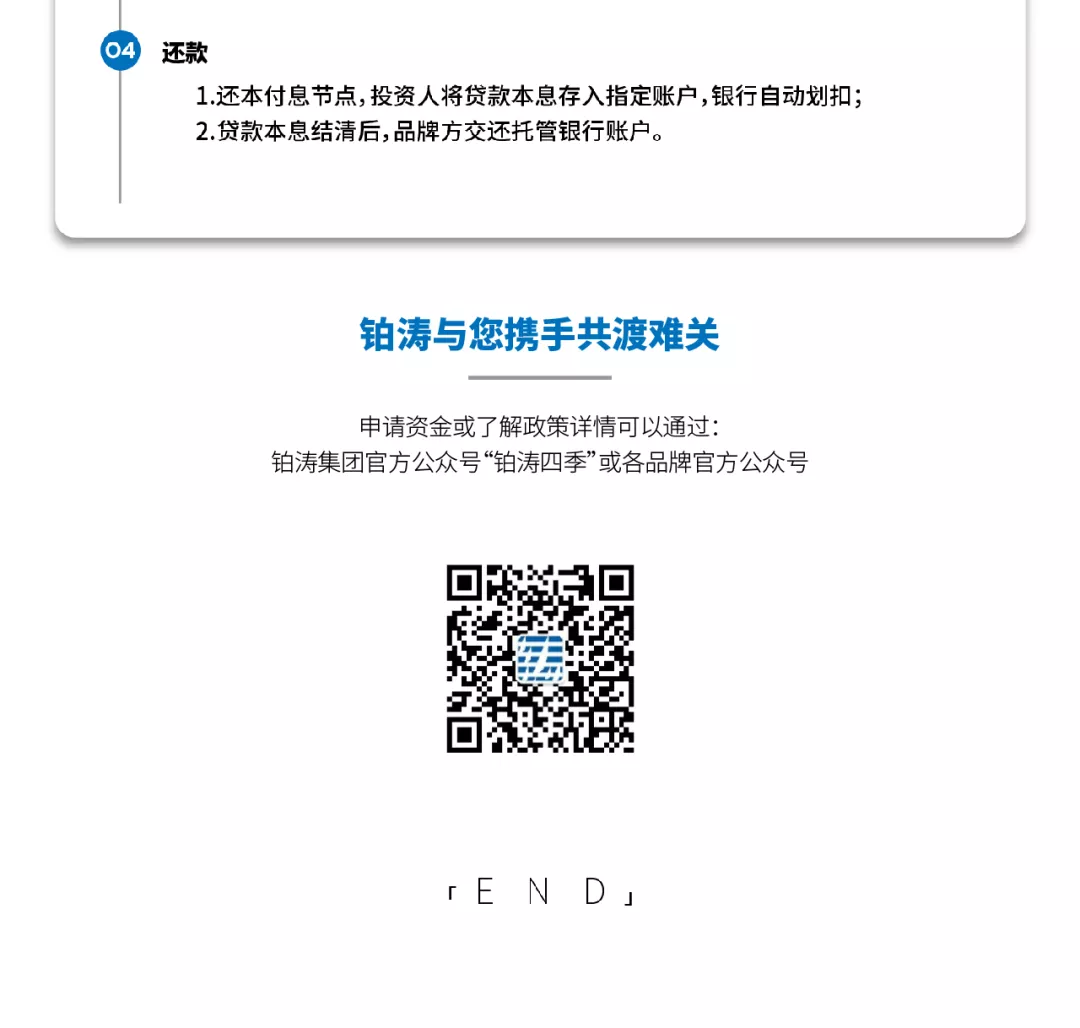 2月11日,铂涛集团发布投资人专项资金援助计划,受到广泛关注。为更好地指引投资人申报该专项资金,即日起,铂涛集团官方公众号“铂涛四季”、各品牌官方公众号及集团官方网站已上线该资金支持细则及申请入口。在困难时期,衷心希望所有需要支持与帮助的投资人伙伴能通过本次的资金扶助措施渡过暂时的难关,携手打赢这场经济仗,共赴未来!