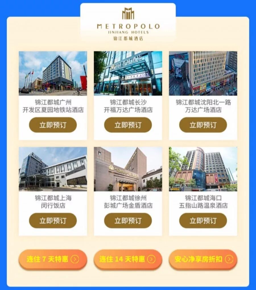 锦江都城公司旗下位于全国的锦江都城、白玉兰、锦江之星等品牌酒店积极响应号召,目前上线酒店超过百余家,分布于北京、上海、广州、天津、石家庄、太原、衡水、霸州、苏州、无锡、杭州、宁波、湖州、丽水、金华、厦门、海口、佛山、中山、南宁、钦州、成都、重庆、西安、银川、贵阳等近三十个城市。