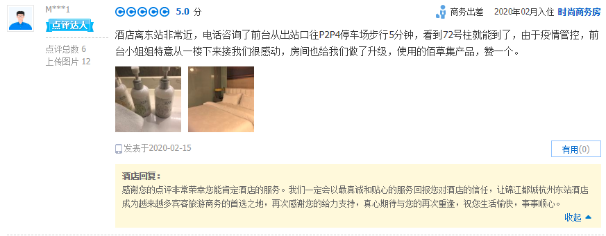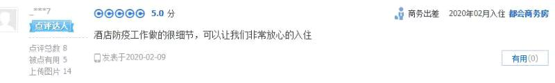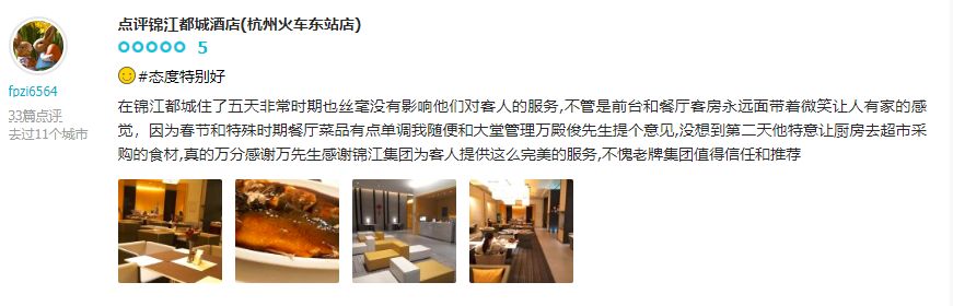 在疫情最严重的时候,没有一家酒店肯收留我们,是锦江都城收留了我们,酒店对客人的关心深深打动了我,住在都城让她倍感亲切,以后出门只选锦江都城。