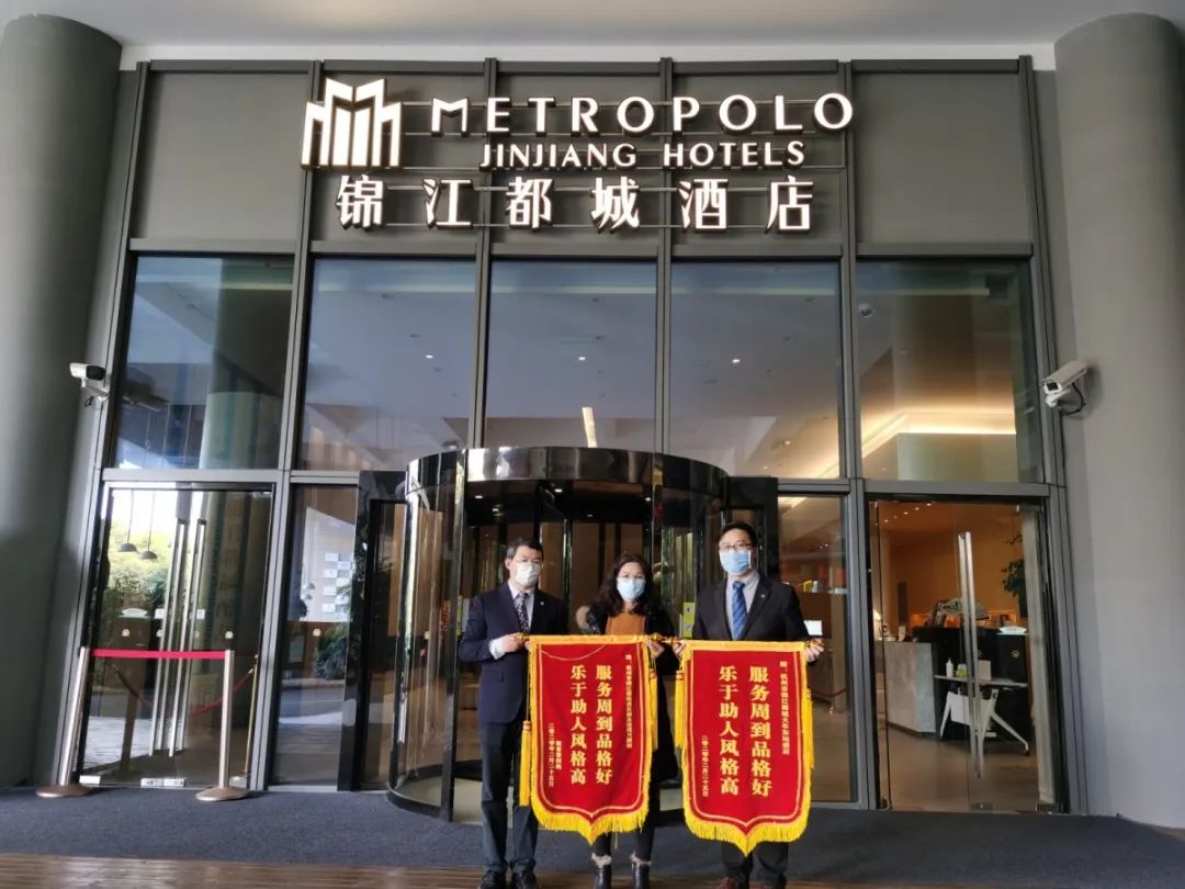 2月25日下午,入住酒店1个月的湖北籍张女士向酒店总经理沈志毅及副总经理万殿骏赠送了锦旗。