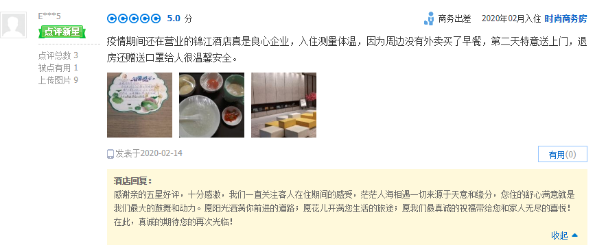 疫情期间还在营业的锦江都城酒店真是良心企业,入住测量体温,因为周边没有外卖买早餐,第二天特意送上门,退房还赠送口罩给人很温馨安全。