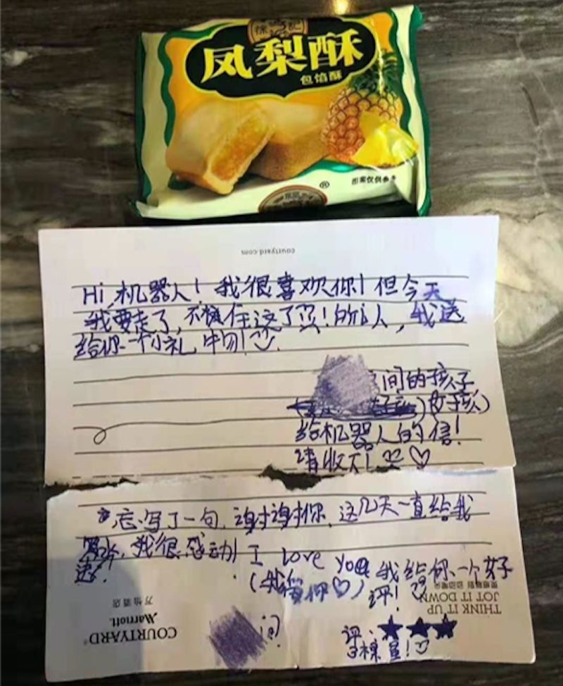 机器人送物对很多客人来说还是很有新鲜感对事情,尤其小朋友很喜欢和机器人互动。酒店机器人作为智能“服务员”当然也会有客人对它对服务做出评价。润机器人在为一个家庭服务送物之后,出现了暖心的一幕。原来,小朋友退房之前在房间里放了一块凤梨酥,下面压着一张纸条,是孩子写给机器人的信,他说:“这块凤梨酥是要留给机器人吃的。”