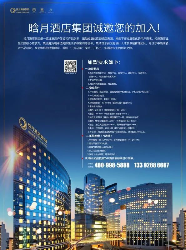 3、晗月酒店集团的蓬勃发展使得越来越多的产品被投入市场,酒店生态、酒店管理、酒店金融作为集团的“三驾马车”,自营“酒店工程+家具公司+云采商城供应链平台+智能科技公司”,坚持“自主设计+自有工程公司+四级质量管控+环保材料”,实现综合成本降低10%~20%、工期缩短1-2个月、开业空档期缩短15天以上, 一站式加盟服务体系,打造酒店业生态圈核心竞争力。