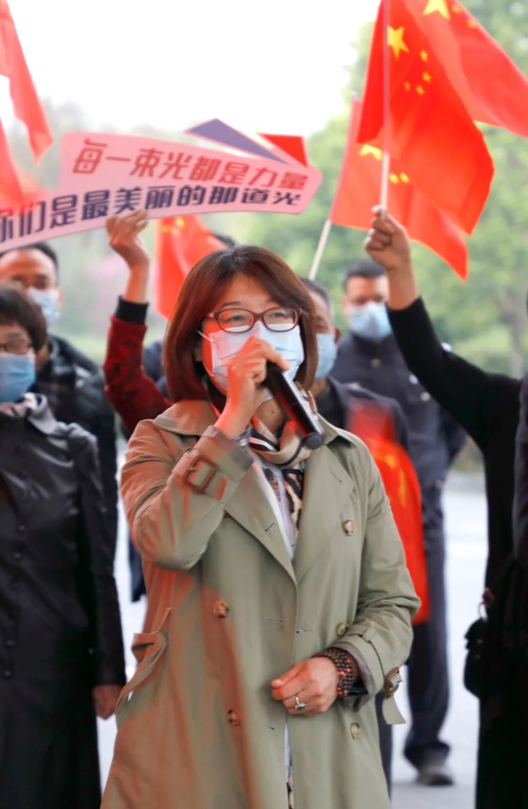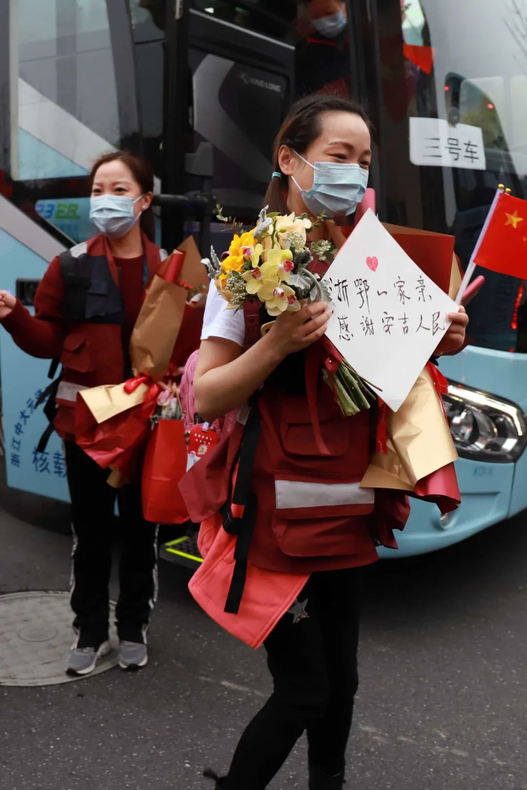 浙江省卫健委一级巡视员马伟杭,湖州市副市长闵云,湖州市卫生健康委党委书记、主任饶如锋,安吉县委副书记、代县长宋波,副县长任贵明等领导出席了此次欢迎仪式。湖州市副市长闵云致简短致辞:“向平安回家和仍坚守在支援湖北一线的白衣战士们,致以崇高敬意和衷心感谢。英雄平安回家是家乡每一个人的愿望。此次取得抗疫的胜利,代表湖州安吉感谢各位的辛勤付出。接下来的时间,希望英雄们以最健康的身体,最愉悦的心情、最好状态和家人、同事团聚,希望大家放松心情、好好休息、调理身心”。