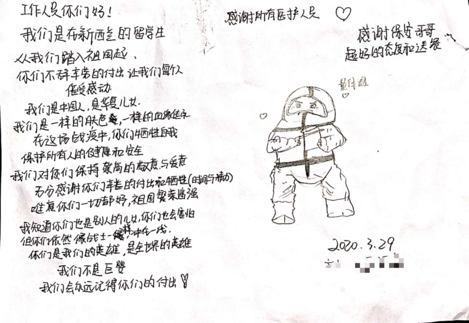 郑则标是海珠区昌岗街社区卫生服务中心的一名基层医生,3月27日晚,他进驻海珠区某隔离酒店开展隔离人员的医疗保障工作。4月4日,郑则标值班,当经过1515房的时候,他看到了一份惊喜——在房门上贴了一张感谢信,信上画着一个穿防护服的医生,上面写到“我们是新西兰的留学生,从我们踏入祖国起,你们不辞辛劳让我们倍受感动,你们像战士一样冲在一线,你们是我们的英雄,是全世界的英雄”,当郑则标看到最后一句“我们不是巨婴,我们会永远记得你们的付出”时,他感到所有的付出都是值得的,无论在境内还是境外,血脉相连的中国人在任何的困难面前都是守望相助,风雨同舟。