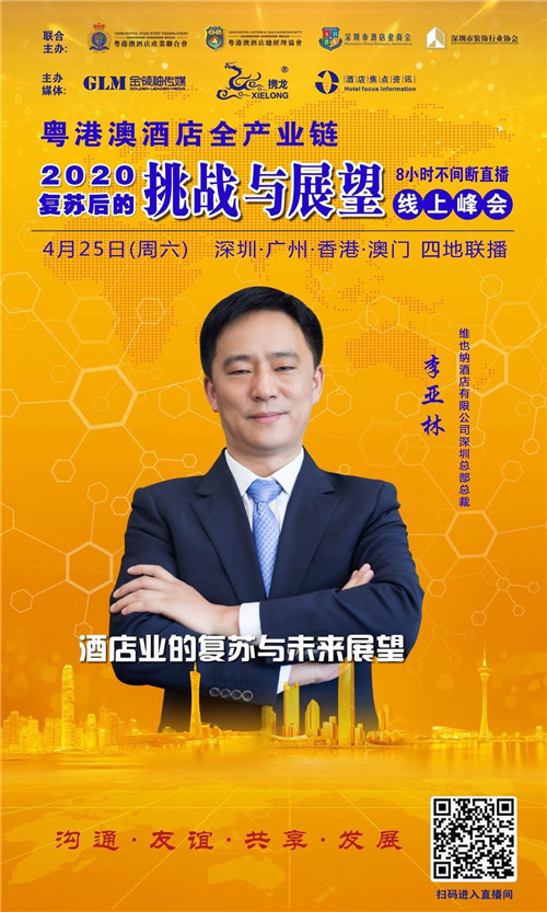 旅宿行业复苏有序进行,摆在从业者面前的挑战变成了酒店全产业链如何重启、相关联产业如何复苏的问题。在此情境下,携龙文旅联合粤港澳酒店产业联合会、粤港澳酒店总经理协会、深圳市酒店业商会等于4月25日主办了一场《粤港澳全产业链复苏后的挑战与展望》线上峰会。广州、深圳、香港、澳门四地连线,维也纳酒店有限公司深圳总部总裁李亚林先生特邀出席,结合维也纳酒店有限公司(以下简称“维也纳”)的复苏进展,发表《酒店业的复苏与未来展望》主题分享,为共同打通酒店全产业链上下游闭环,探讨和解决酒店全产业链的复兴之路出谋划策。