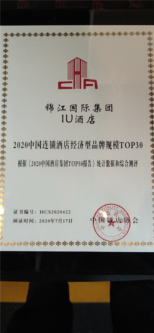 2020年7月17日,由中国饭店协会举办的第九届中国饭店文化节暨全国饭店业振兴大会在广州隆重举行,IU酒店荣列“2020中国酒店业规模榜单” 中国连锁酒店经济型品牌TOP 30。