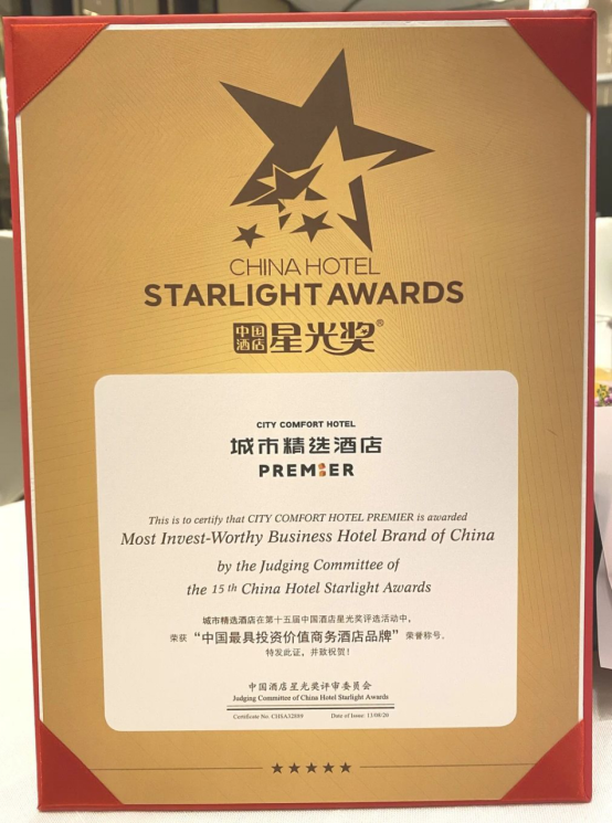 同期举行的第十五届中国酒店星光奖颁奖典礼上,城市精选在宽频市场的成功尝试,赢得了参会投资人与业界高度认可,一举斩获本届星光奖“中国最具投资价值商务酒店品牌”称号。城市精选的惊艳表现,实至名归。