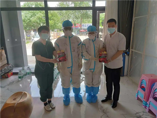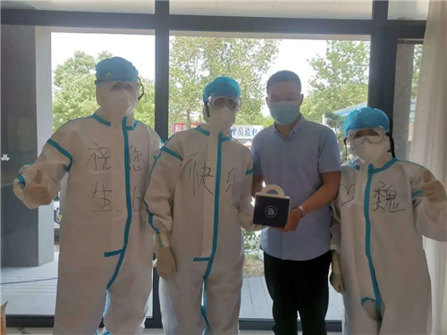 比如酒店工作人员会小心记好每个在店隔离客人的生日,并在生日当天送上小蛋糕庆祝;隔离期满的客人会为酒店工作人员送上感谢的锦旗、礼物。因为穿着防护服不方便沟通,工作人员就把想表达的话写在防护服上:祝你生日快乐、六一儿童节快乐……
