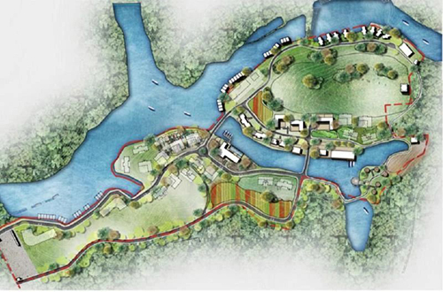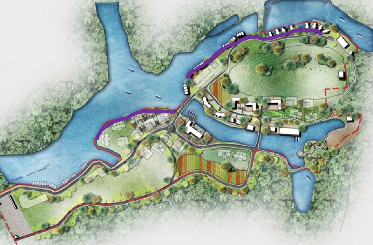 项目将以欧洲皇室热衷的野奢度假为蓝本,把奢华酒店的配置搬到惠州“肯尼亚”,并紧紧围绕该项目拥有的稀缺黄金湿地水岸线进行爆款打造(下图紫线区域)。如设置野奢帐篷,打造湿地生态长廊+码头,非洲仙人掌景观等融于自然的体验场景,让项目的野性真正显现。