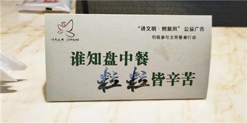 除了自助餐厅外,大堂醒目位置、包厢及宴会厅门口设置公益广告、告示牌、LED屏幕光盘行动等,拒绝浪费、按需取餐等相关提示语等方式,积极营造节约粮食、文明餐桌的良好氛围。