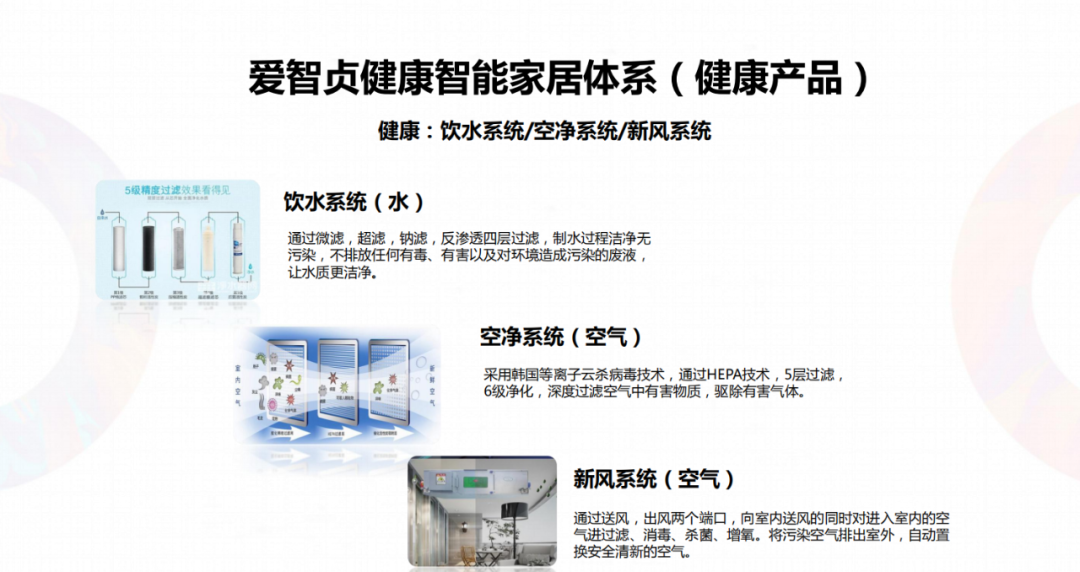 其次,室内空气质量也是智慧健康酒店体系的重要方面,而爱智贞的空净、新风系统能够击中酒店客房甲醛异味、空气质量不佳等问题,采用韩国等离子云杀毒技术,过滤室内污染物,为酒店客房引入清新健康的空气。此外,还有健康饮水系统,通过微滤、超滤、纳滤、反渗透四层过滤,洁净水质供消费者放心饮用。
