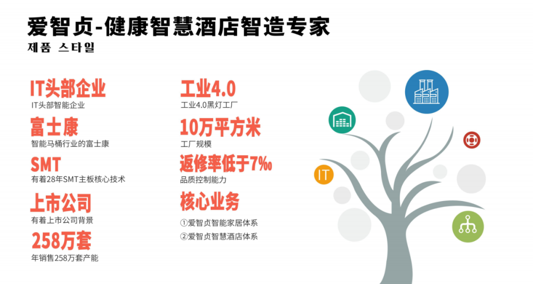 依托韩国电子元器件作为品质保障,以及10万平方米国际现代化厂房,SMT现代化制造生产线等核心技术,爱智贞开辟出以研发、生产和销售爱智贞健康智慧酒店体系、爱智贞健康智能家居体系为主要核心业务的发展方向,并获得超过20项行业首创的专利技术。
