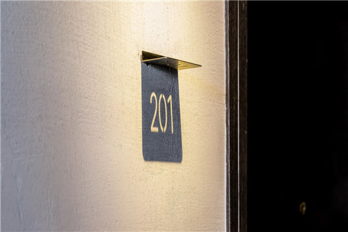 当客人办理完入住走向自己的客房时,就能看见每间客房门口特别的门牌号设计。ZMAX HOTELS别出心裁的采用了投影标识,选择通过射灯将门牌号投影上墙面,艺术感和实用性兼具。射灯之所以采用暖黄色,其灵感也来自于啤酒,色泽金黄的啤酒最为常见。客房内洗手台的设计则提取了酿酒厂设备的结构,在酒店整体“提炼天然材料元素作为装饰,赋予空间原始粗糙的美感”的设计基调上,增加了工业元素,低调而时尚。除此之外,ZMAX HOTELS内的香氛和洗护用品也都带有特别定制的啤酒花香味。通过视觉和嗅觉,为住客营造出令人难以忘怀的感官体验。