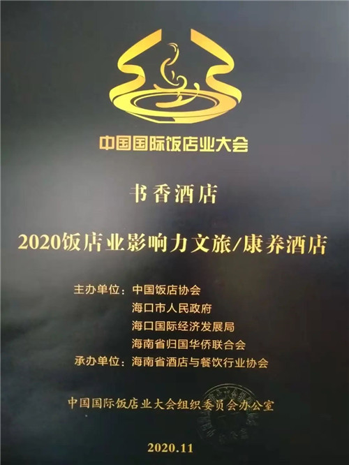 11月27日,海南香水湾书香海景酒店受邀出席,2020年第五届中国国际饭店业大会,并获2020年度“饭店业影响力文旅/康养酒店”、“饭店业总经理五星勋章”两项殊荣!