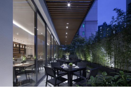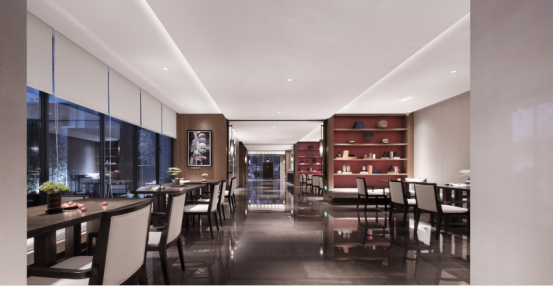 从前台到餐吧,一路耀州窑的黑白刻花瓶引领,融入壁柜半围合空间的书吧,走到尽头,便是能够透过落地窗看到竹林的小餐厅,十分清新雅致。