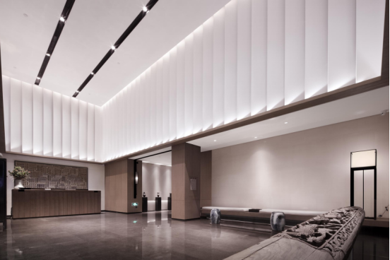 酒店整体呈现马蹄形,拢成一个内凹的气场,弧形沿线内部是通道,内置77间智能化配套客房,整体设计风格极简,融入了浓厚的潮州等传统文化元素,独具岭南文化特色。