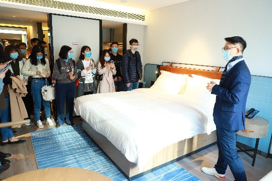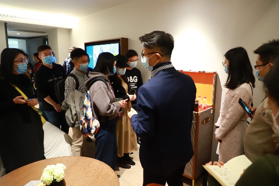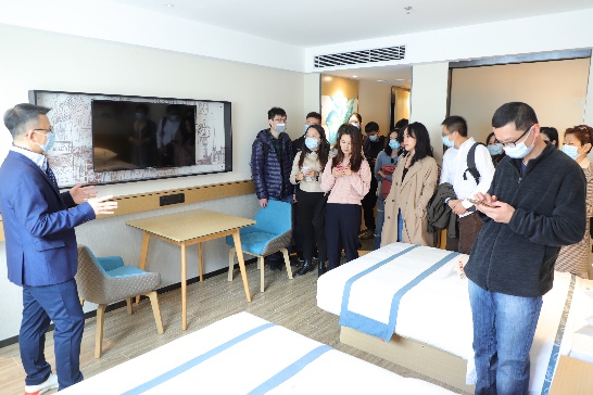 参观样板间时,东呈旗下文化多元、风格多样的酒店品牌矩阵,充满人性关怀和科技感的产品与服务,给中山大学旅游学院MTA硕士班师生留下了深刻印象。不少同学在样板房驻足拍照打卡,并表示想尽快去东呈各个品牌酒店入住体验。