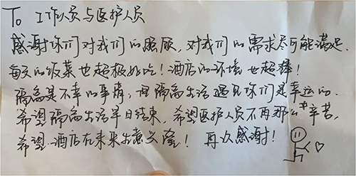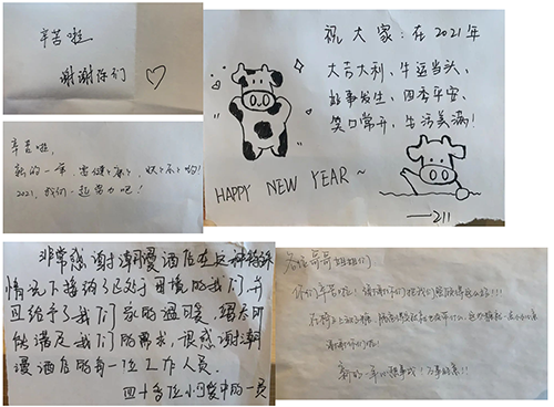 原来,酒店员工们所有的坚持与努力,他们都看在眼里藏在心里,汇成了一句句的感谢与辛苦了。