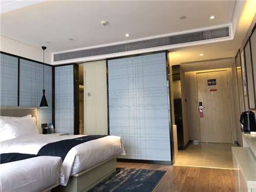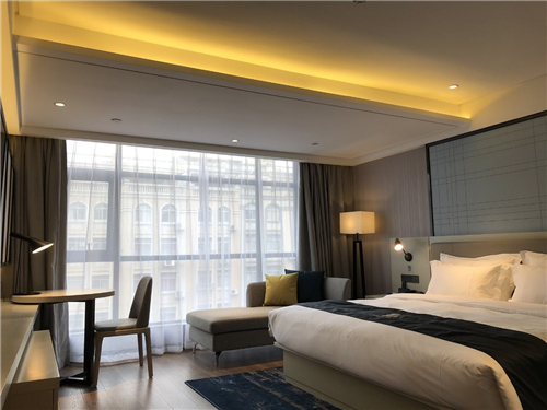 客房整体上采用了中性色调,在柔和的灯光下渲染出安逸轻松的生活气息;蓝色的床头背景墙和长线吊灯很好地拉升了空间的纵深感;易于操作的床头灯设计也是充分考虑到实用的功效;简致桌椅和质感灰的半包围沙发也展现出北欧简约的审美品位。不同的房间类型也能充分满足客人的出行需求。浴室和卧室之间采用灵动的移门设计进行空间隔断,更加简洁美观。