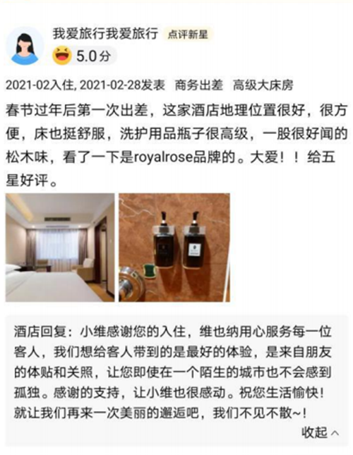 在对顾客的回访以及调查中,维也纳酒店不断完善服务,连顾客日常洗护用品都做了大量的调查,正式启动洗护升级,最终选定法国皇室玫瑰RoyalRose,为客户带来浪漫、温情、体贴。