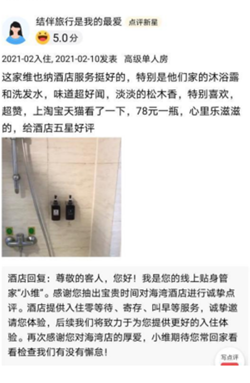 作为全网唯一的真正松木精油洗护用品,凭借其浪漫、尊贵、深邃的氛香在维也纳酒店中也获得了不少旅客们的认可。让我们看看下面部分门店旅客们的点评吧!