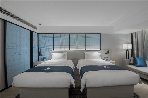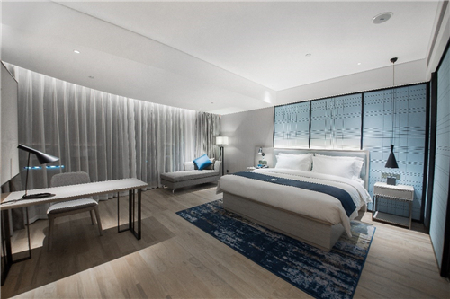客房整体色调采用了代表自然的三原色,分别是极光红、峡湾蓝和松果木,三者的巧妙结合渲染出宁静美好的自然气息。半包围的床头背景墙色彩温和,柔化了整体空间氛围,长线吊灯充分地拉升了视觉空间感。除此外,木色桌椅和质感灰的长沙发还提供了会客商务、学习办公的载体。多种房型也更好地满足了客人的需要。