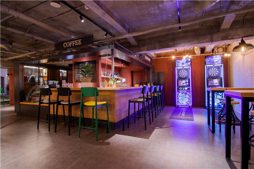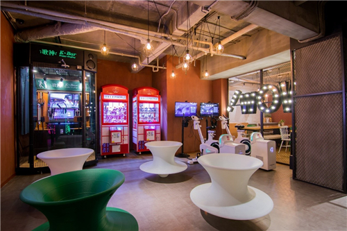 YUNIK HOTEL 公区的存在,让这里变身为可以玩游戏、喝鸡尾酒、品咖啡、看电影的互动空间,为年轻人创造出了更多元丰富的旅宿体验。公区大堂以砖红色为主调,颇具潮流工业风,餐厅、酒吧陈列着飞镖机、唱K 等当下年轻人喜欢的设备。